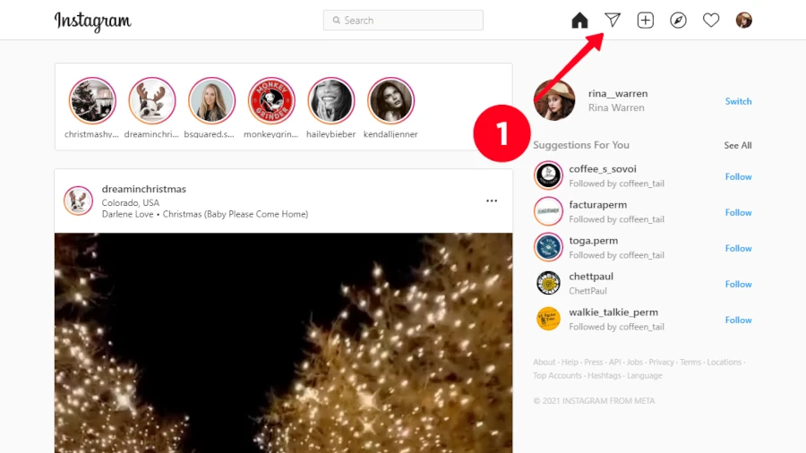 نسخه تحت وب اینستاگرام را در مرورگر باز و روی آیکون هواپیما در بالای سمت راست کلیک کنید؛