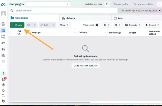 پس از ورود به Ads Manager، داشبورد خود را مشاهده خواهید کرد. برای ایجاد یک کمپین، مجموعه تبلیغاتی یا یک تبلیغ، روی دکمه Create کلیک کنید.